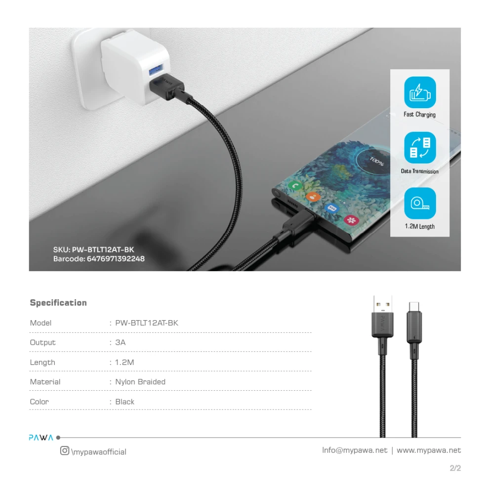 استمتع بشحن سريع وموثوق لجهازك مع كابل PAWA PW122 USB-A إلى Type-C، المصمم لتلبية احتياجاتك اليومية سواء في المنزل، المكتب أو أثناء التنقل. يوفر الكابل شحنًا سريعًا بتيار يصل إلى 3 أمبير ونقل بيانات فعال بين الأجهزة.