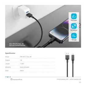 اشحن جهازك بسرعة وكفاءة مع كابل PAWA PW122 USB-A إلى Lightning، المصمم لتوفير شحن سريع بتيار يصل إلى 3 أمبير ونقل بيانات سلسة بين أجهزتك المتوافقة مع Lightning مثل أجهزة iPhone و iPad. الكابل مزوَّد بتصميم مضفر قوي يمنحك متانة عالية وتحمل أكبر أثناء الاستخدام اليومي.